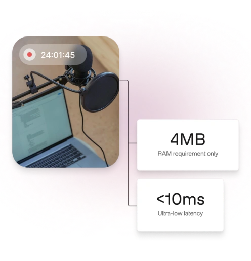 Transform streaming audio in your software applications and edge devices. Enhance sound in real time with low latency across a range of models to suit your software. Versatile across language and devices.