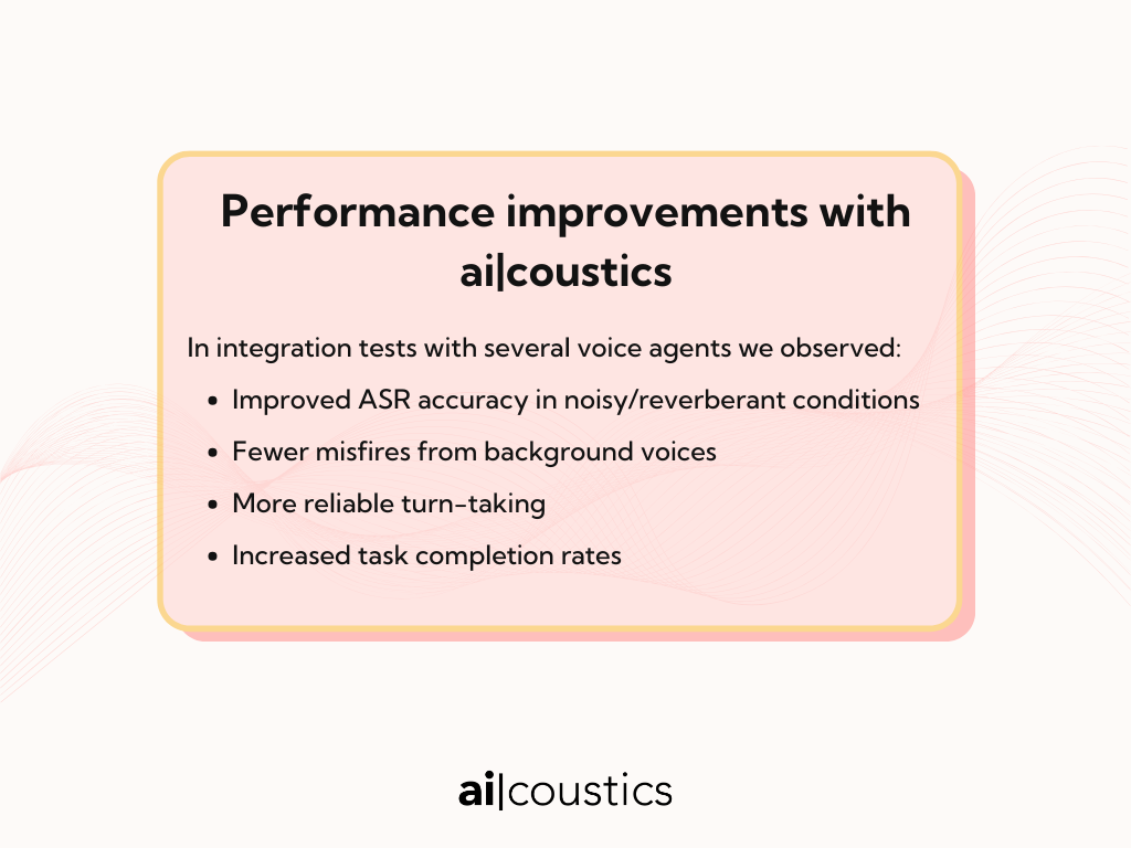 The ai-coustics SDK enhances real-time audio input for voice agents, optimizing speech clarity and VAD performance across environments.